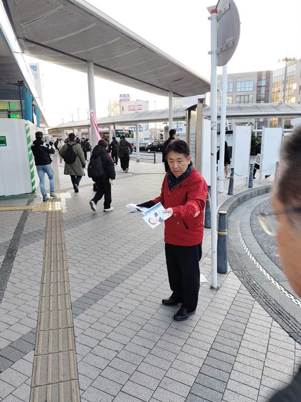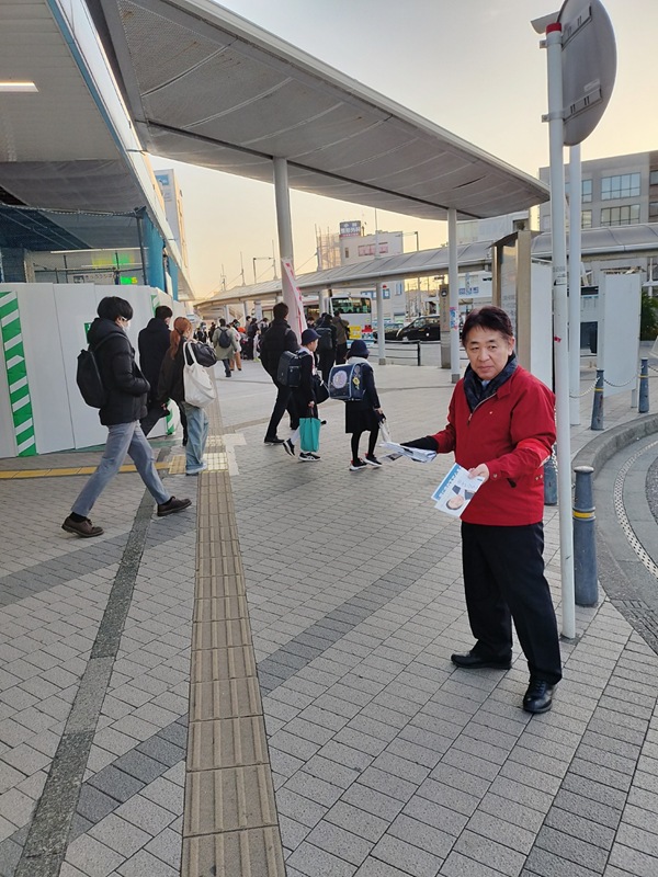 逗子市議選予定候補の岩室年治氏とJR逗子駅で早朝宣伝